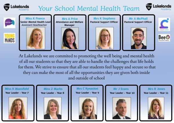 At Lakelands, we are committed to promoting the wellbeing and mental health of all of our students so that they are able to handle the challenges that life holds for them. We strive to ensure that all of our students feel happy and secure so that they can make the most of all of the opportunities they are given both inside and outside of school. We educate our young people in the importance of mental health and wellbeing through PSHE sessions delivered by form tutors, assemblies and marking special events throughout the year such as Children’s Mental Health Week.